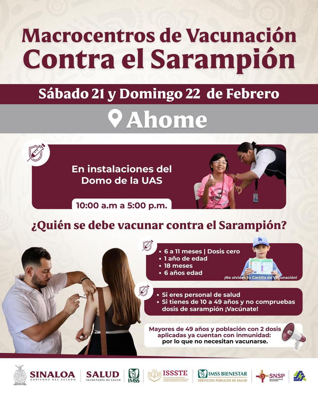 Culiacán, Sinaloa.- La Secretaría de Salud informa a la población que, con el objetivo de fortalecer la protección contra el sarampión, se instalarán macrocentros de vacunación en distintos municipios del estado durante esta semana. Se exhorta a madres, padres de familia y población en general a acudir a los puntos de vacunación para completar o