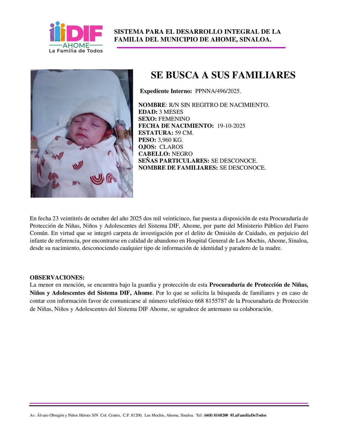 Los Mochis, Sinaloa._ Se solicita la colaboración de la ciudadanía para localizar a familiares de una bebé de tres meses que está bajo la guardia y custodia de DIF Ahome, luego que su madre la abandonó al nacer, informó Nancy Janeth Niebla Valdez. La directora de DIF Ahome aclaró que una mujer dio a luz