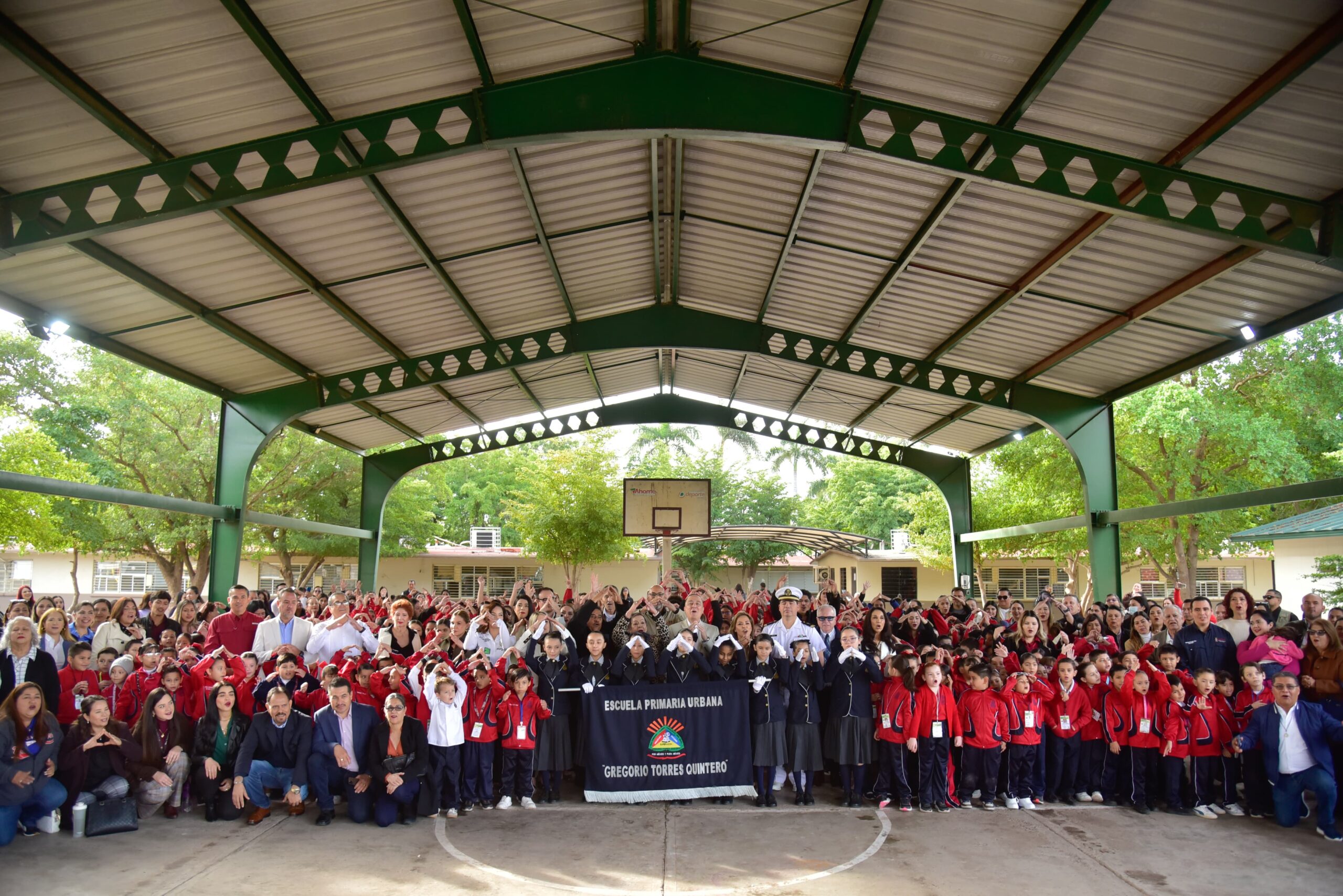 Durante la ceremonia, alumnas y alumnos formaron con sus manos el símbolo de “Ahome, la Casa de Todos”, gesto que generó una reacción emotiva del Presidente Municipal, Antonio Menéndez de Llano Bermúdez, quien agradeció la sorpresa y reconoció el valor de la educación como base del futuro del municipio.